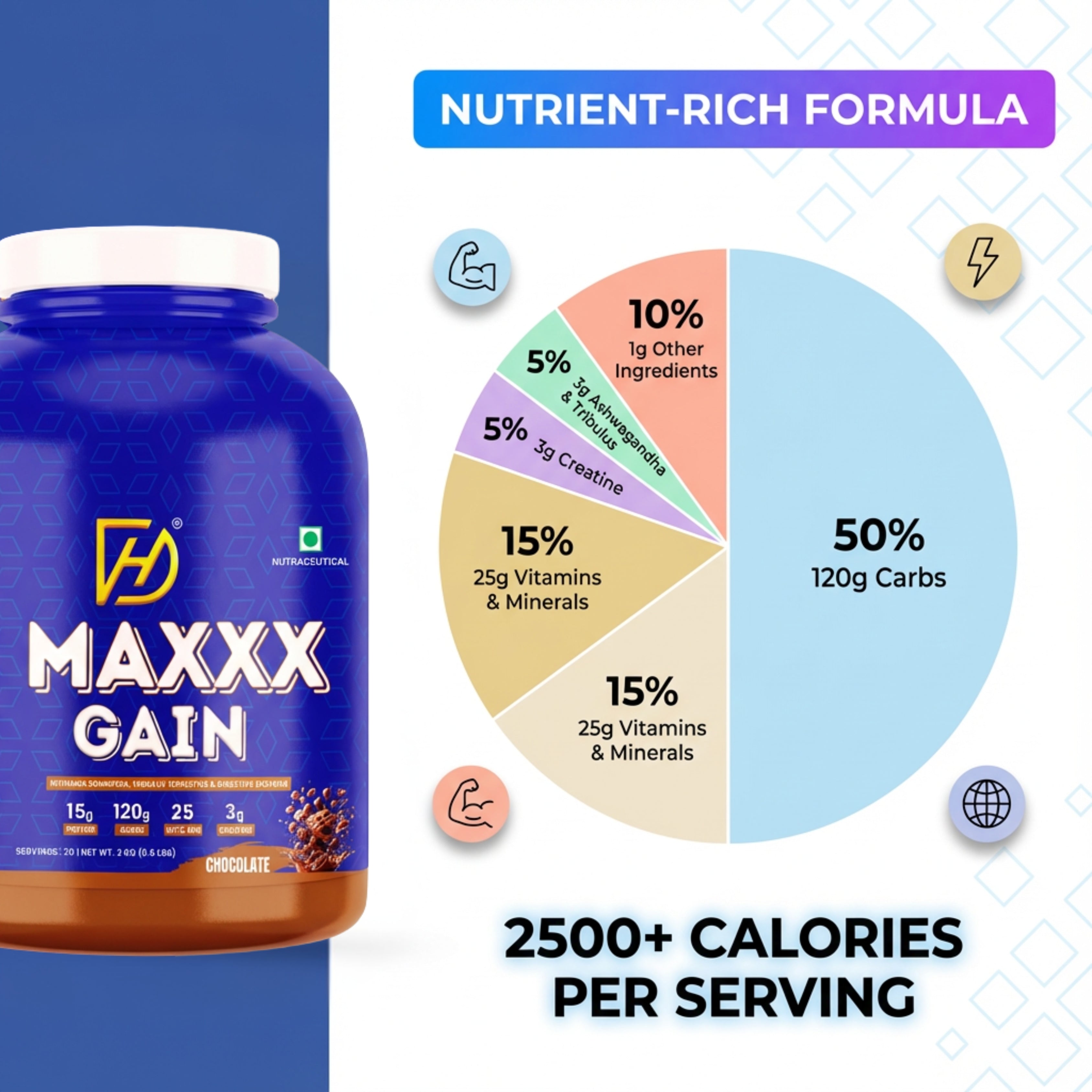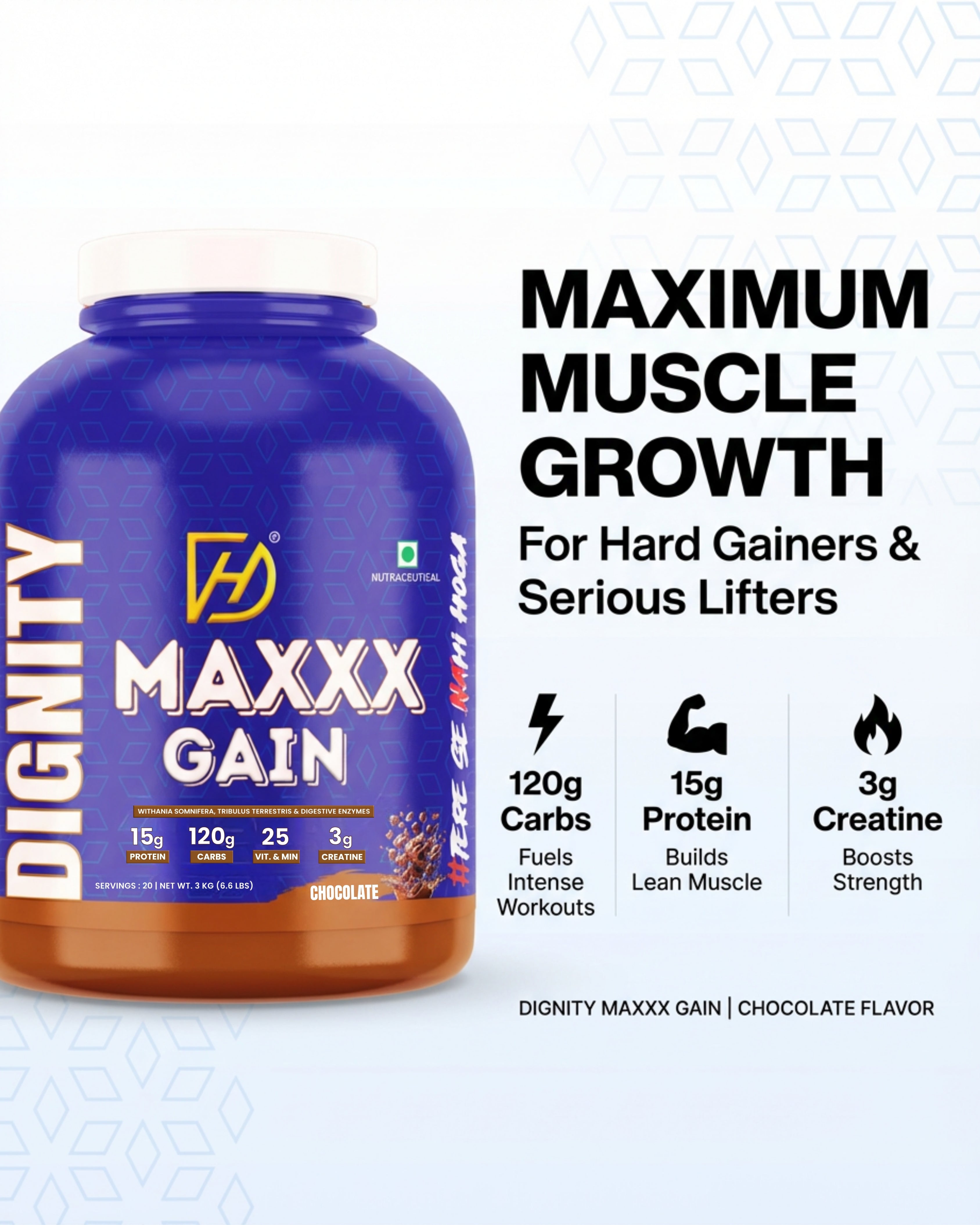 ⚡ High-Calorie Carb Matrix (120g Carbs) – Fuels intense workouts and supports rapid weight gain